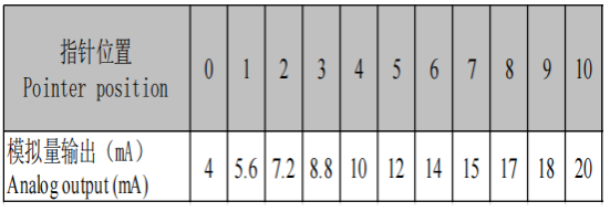 Saat mengonfigurasi fungsi output analog untuk pemantauan level oli secara real-time di konservator oli, penunjuk pengukur level oli sesuai dengan output analog 4mA dan 20mA pada posisi 0 dan 10 skala dial masing-masing, dan sudut 0-10 skala dial pengukur level oli adalah 270º atau 120º, dan hubungan antara output analog mA pada setiap posisi dan sudut ayunan penunjuk dial pengukur level oli adalah sebagai berikut: