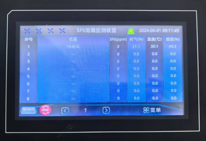 A parte superior da interface principal é a barra de título e inclui o nome do sistema e a hora do sistema. No meio estão os dados em tempo real do sistema e, de acordo com os botões de página para cima e para baixo na parte inferior da tabela, os dados de telemetria em tempo real de cada ponto de monitoramento podem ser visualizados. A parte inferior do botão de exaustão forte, o botão de parada de emergência e o botão de menu. Em circunstâncias normais, o dispositivo não tem alarme, o ventilador é completamente desligado e o local da região pode ser definido pelo usuário.