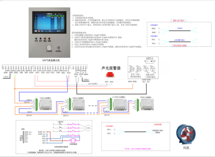 O sistema de alarme e monitoramento de vazamento de gás SF6 consiste em um transmissor 4 em 1, um transmissor de temperatura e umidade ambiente (opcional), um host de monitoramento, um grande visor de LED (opcional) e um sistema de monitoramento de fundo. O transmissor é usado para a coleta de dados no local, o host de monitoramento adota um visor LCD colorido com escrita clara, o host exibe a concentração de gás SF6, a concentração de oxigênio, a temperatura e a umidade no ambiente da câmara de gás de comutação no local, o que é claro à primeira vista, e pode ser predefinido com sinais de alarme, iniciar manual e automaticamente o ventilador, etc., e é capaz de se comunicar com os dados de bastidores por meio do RS485.